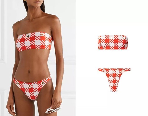孔眼装饰方格抹胸式比基尼