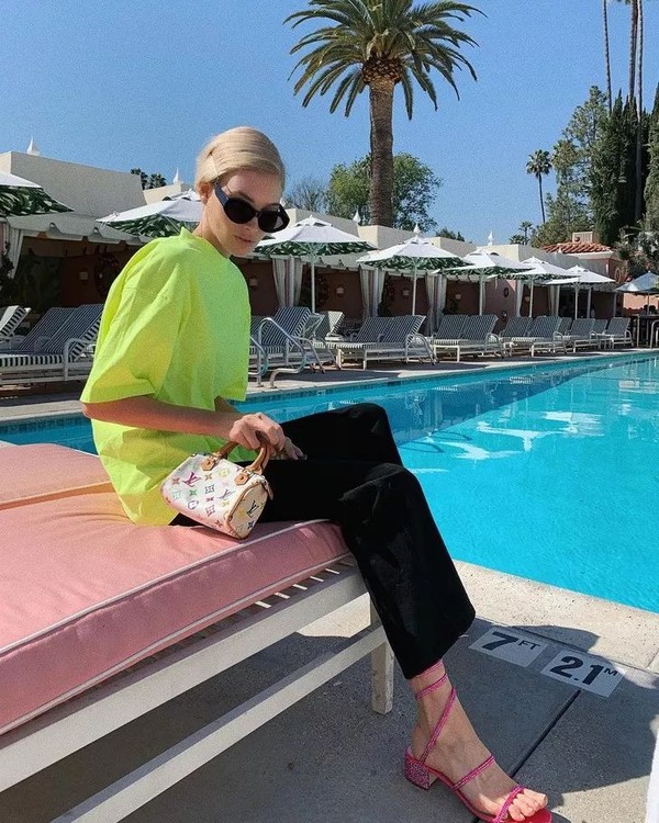 对于时下流行的街头风格穿搭来说,这位天使也是手到拿来。简单的一件Oversize T恤,很多人会拿来做下装失踪或是运动搭配,结果这位天使给配上了直筒裤和细带凉鞋?结果却很好看!