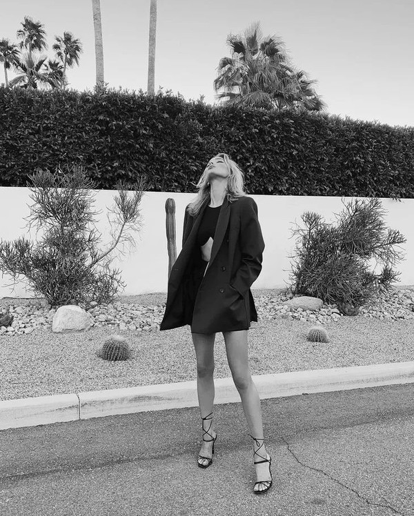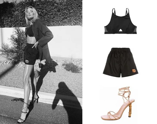 不愧是维密的称职代言人,内衣当做内搭的造型不要太优秀。将一件文胸搭配西装和细带凉鞋,依靠无处不在的巧思和细节取胜,一身黑也毫不单调,可见穿搭功力之深厚。
