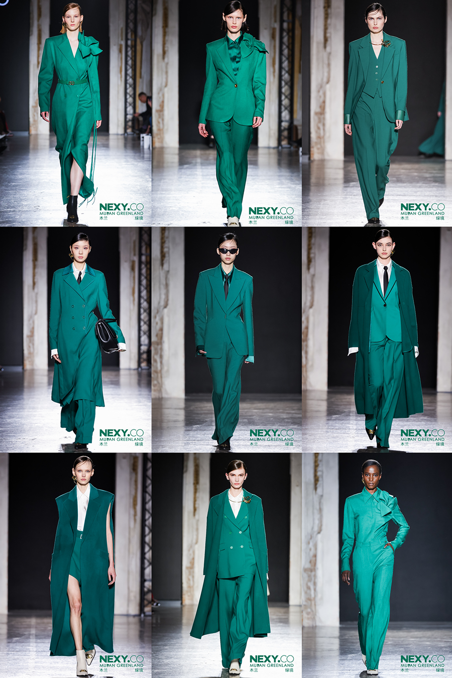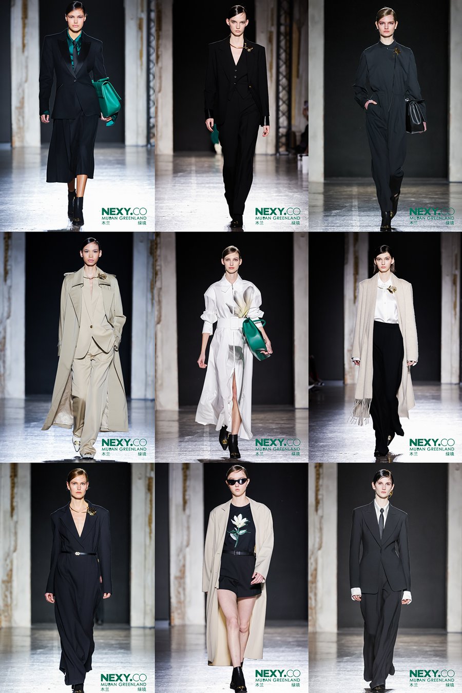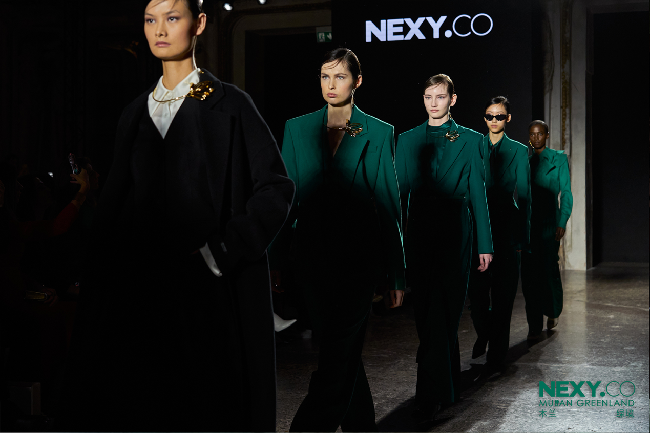 大秀以“木兰绿境”为主题,将品牌色奈蔻绿作为秀场主色调,将木兰花运用在图案和工艺之上——立体裁剪的匠心工艺将木兰赫然伫立在服装领部,彰显蓬勃的生命力量;数码定位印花将木兰花稿更生动还原,栩栩如生;精雕细琢的金属木兰饰品与服装一起呈现都市木兰刚柔并济的时代姿态。以经典西装π suit为智美名片,经典大衣94050包罗时尚万象,为NEXY.CO(奈蔻)品牌“知性、简约、智美”的标志性风格增添了更为丰富的诠释,用时装致敬都市精英女性的智美之姿。