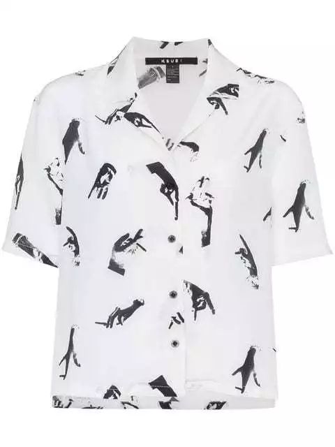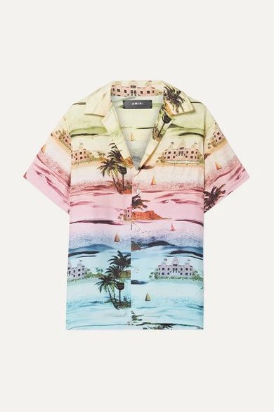 到Amiri的威夷风衬衫搭配黑色Bra和牛仔短裤,率真又随性,椰树林的印花设计搭配多彩的渐变配色让人仿佛一秒回到温暖的夏天。