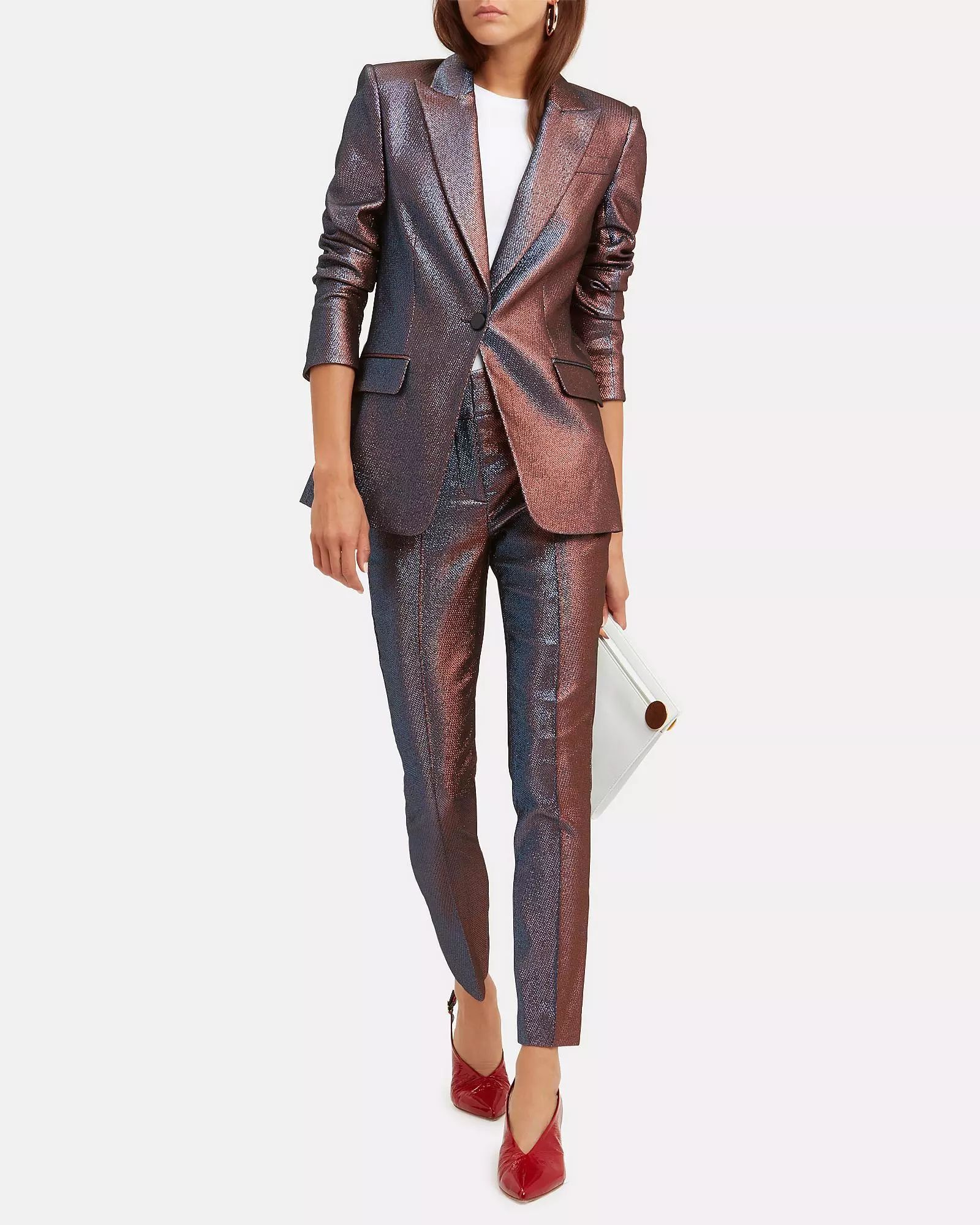 相比传统all black的成套西装,Ella的这身Veronica Beard金属紫修身西装打破纯黑西装的沉闷老气,亮面材质更添高级质感。搭配黑色v领内搭利落又干净,显得Ella又A又酷。