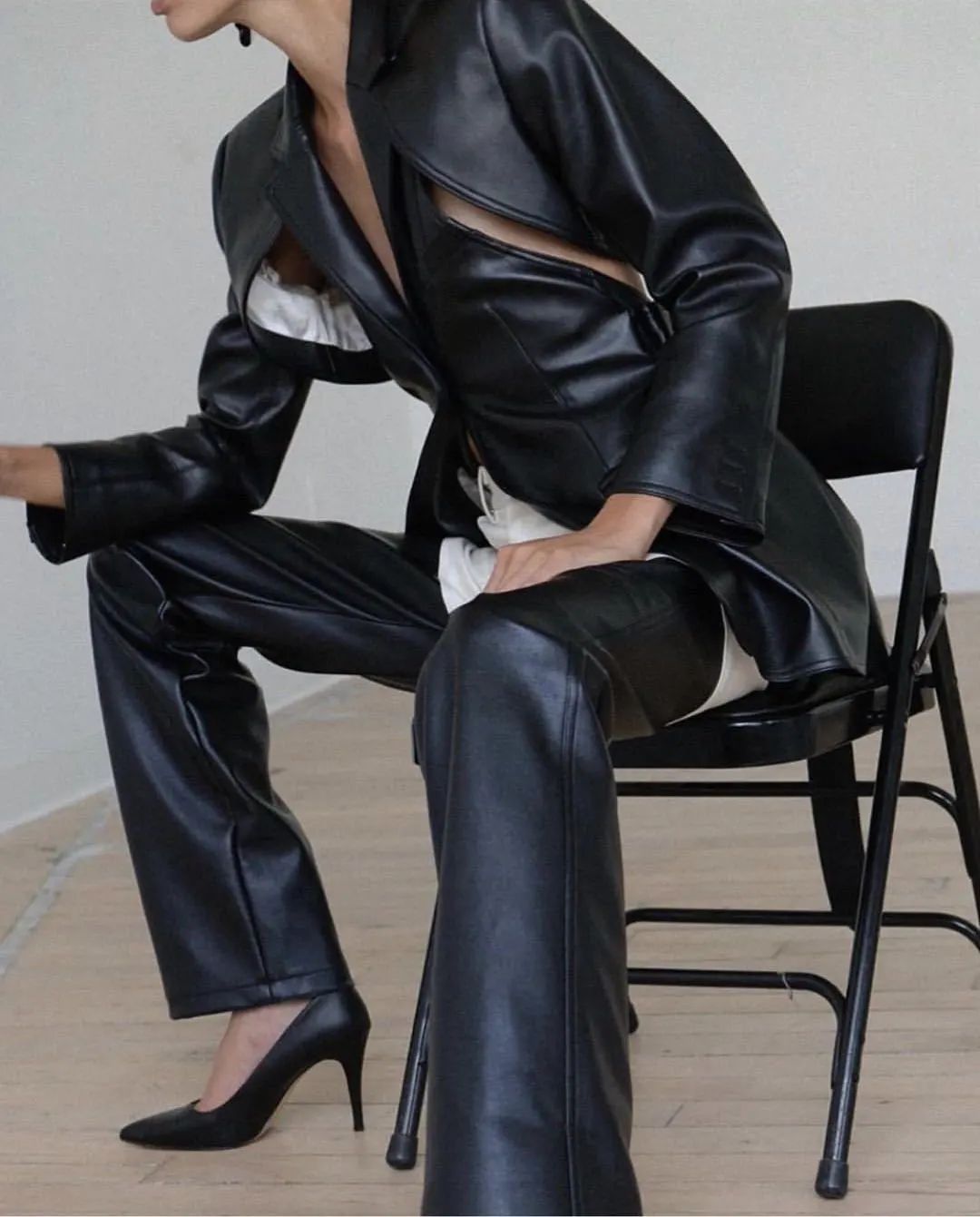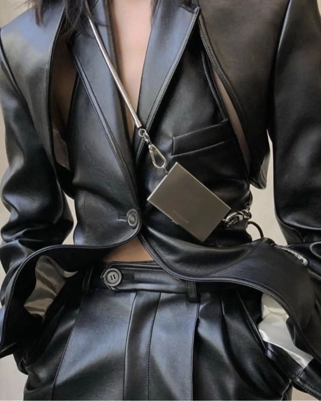 他把男装利落的剪裁和女性优美的时装结合在一起,混合出了摩登又优雅的影子,看看这款黑色皮质西装,穿上后有没有飒到你?