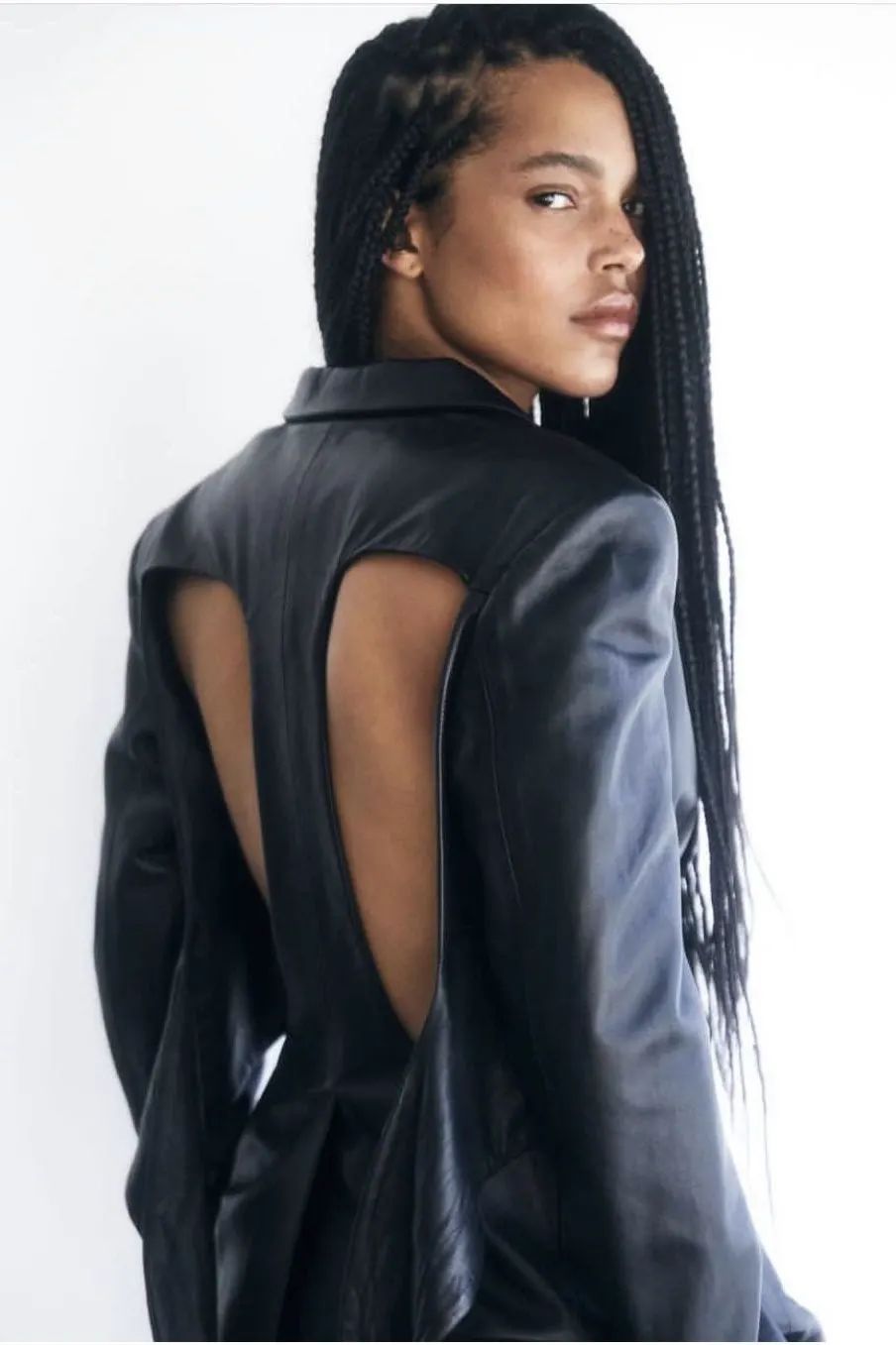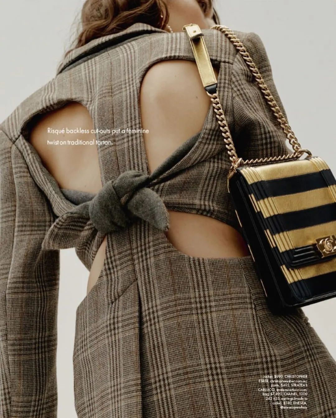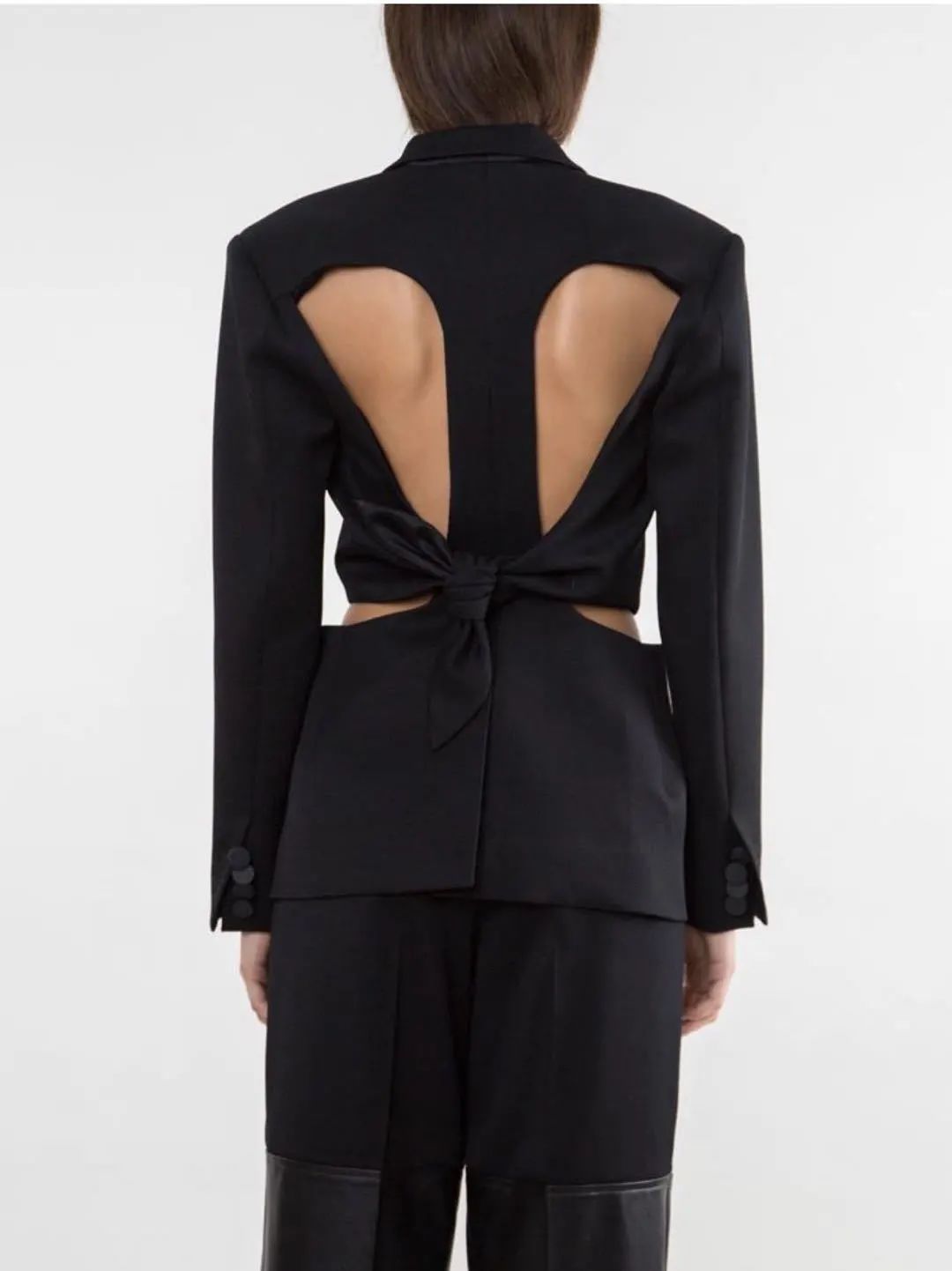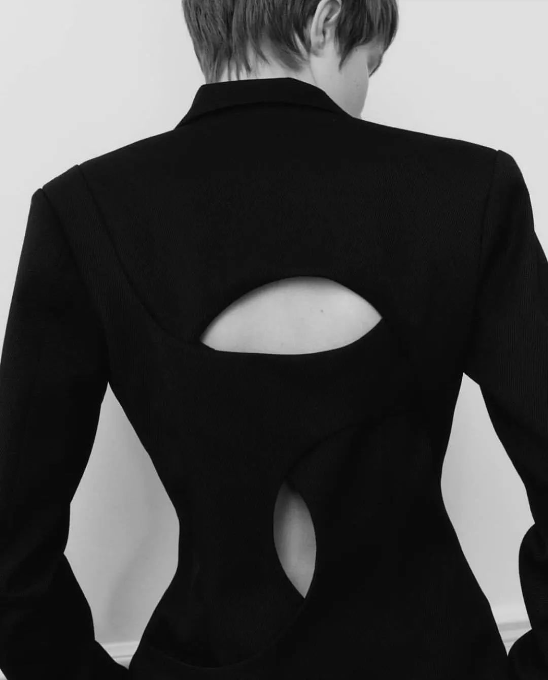 更大胆的姐妹,还可以用这件大面积露肤的西装来彰显时髦精本色,背部流畅的剪裁不仅突显了直角肩,还可以让纤细的腰部一览无余。