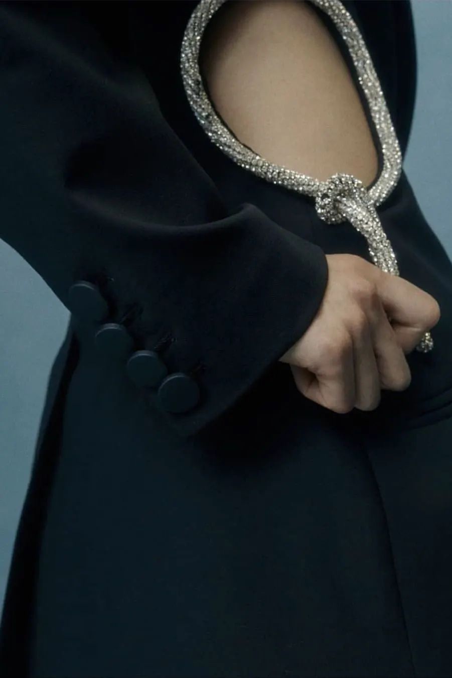带有水钻镶边的镂空西装也可以说是非常令人惊艳了,正面看还很平淡,但是露出背部就是满满的“小心机”,营造出低调的华丽感,很适合在Party中Battle。