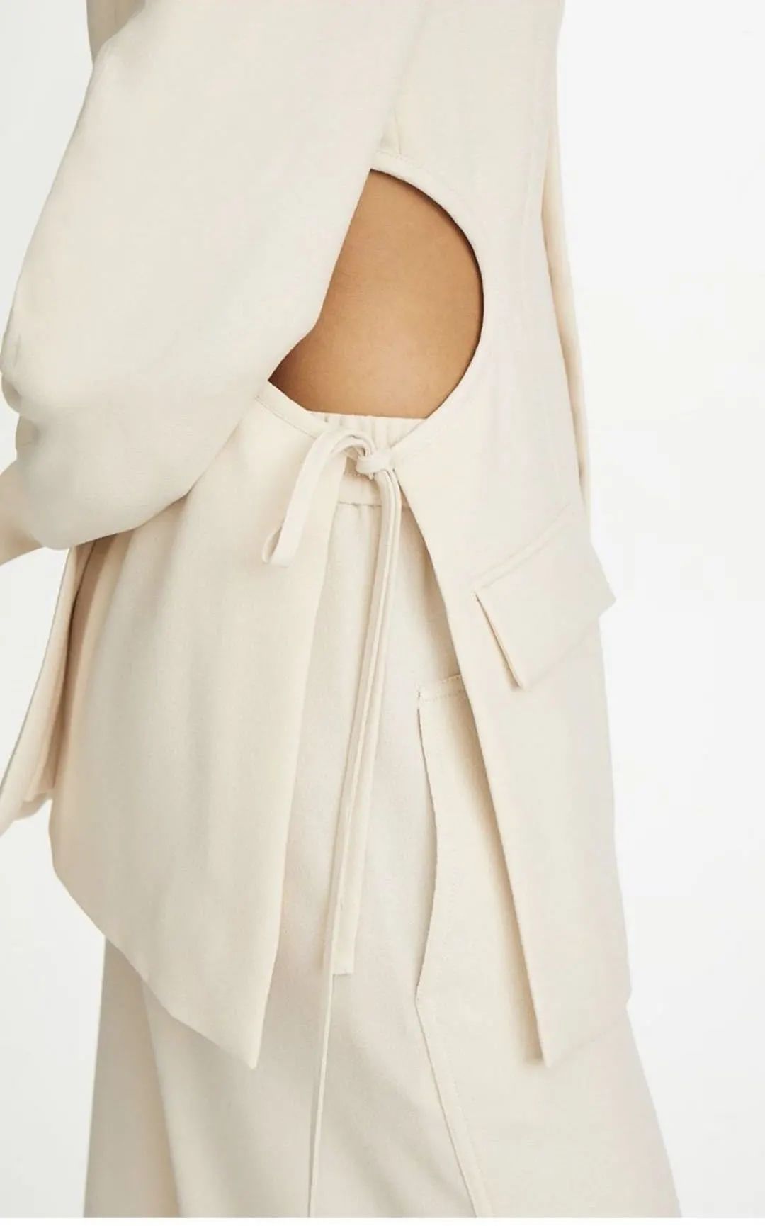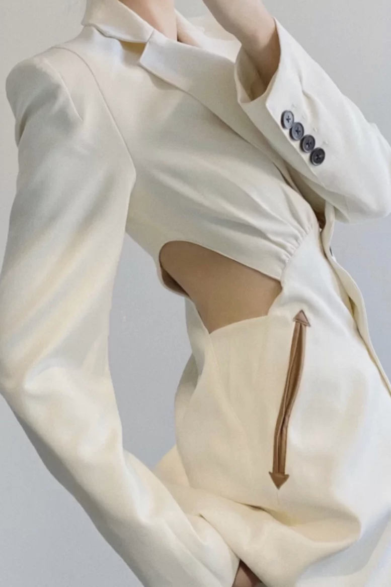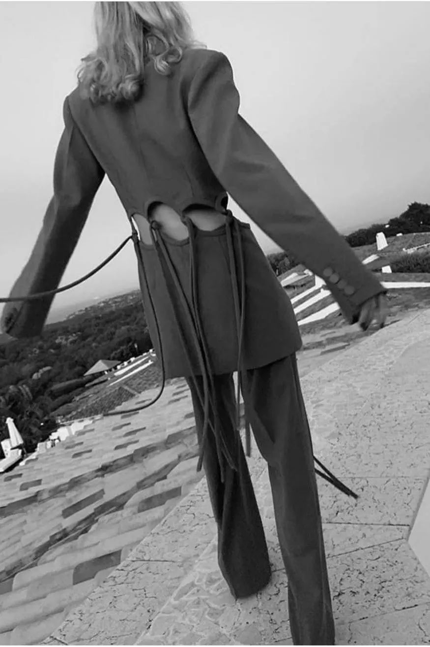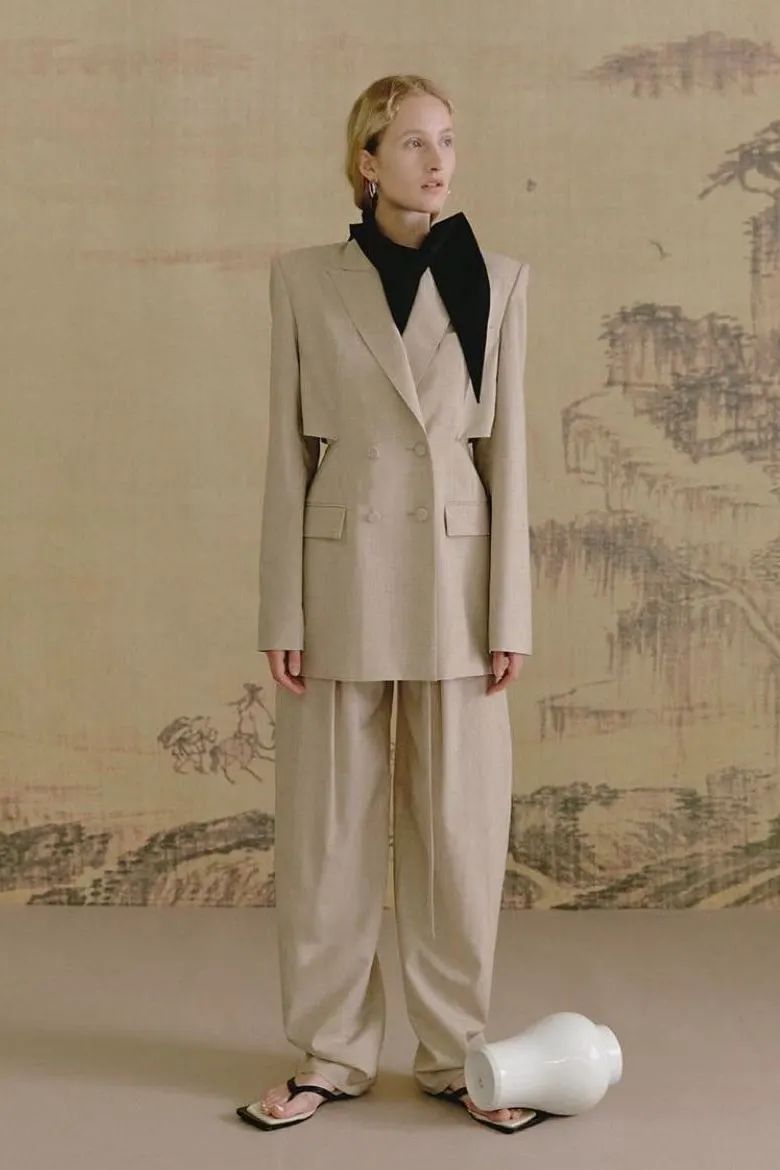 除了鱼骨西装,Dion Lee还推出了几款简单的挖兜款式,这款Lounge西装,两侧采用绑带设计营造出挖空的效果,可以合起,也可以自由张开。
