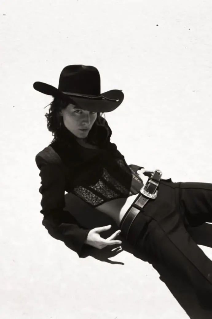 张天爱利用黑色的镂空廓形西装搭配漆皮渔夫帽打造酷飒型格,和姐姐平日里走的甜美风完全不同。