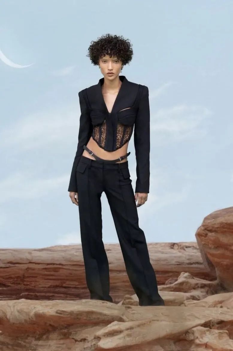 布满蕾丝的修饰,在熟悉的鱼骨设计和西装廓形的加持下,跳脱仅有性感的成分,多了些优雅恣意的知性气质,将极简主义提升到另一境界。
