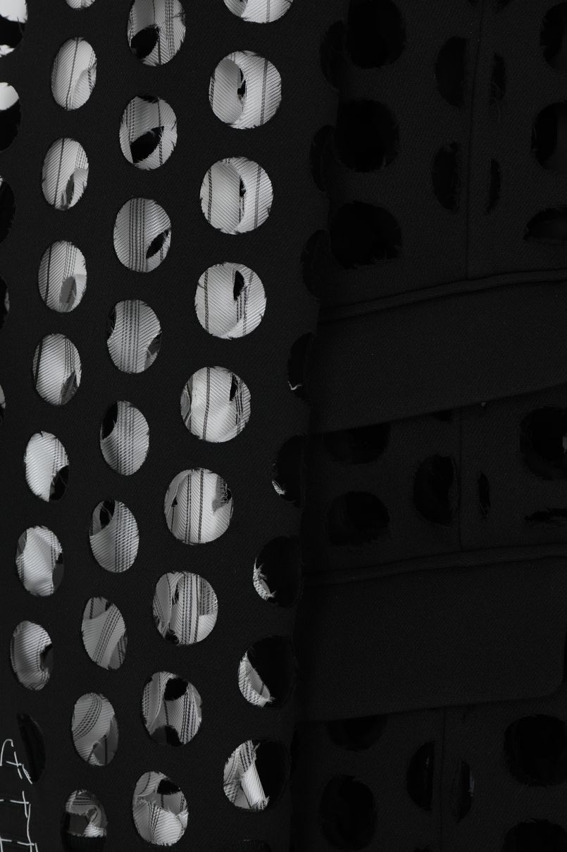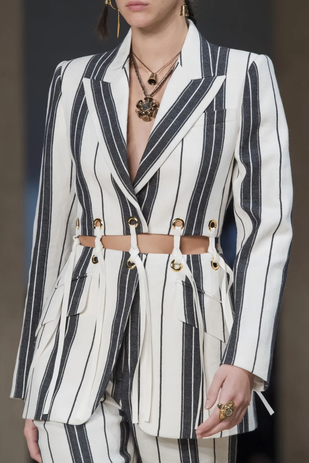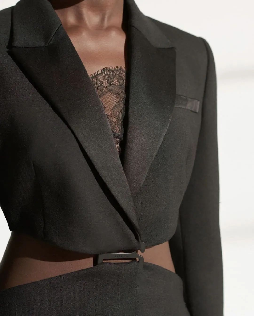 以往代表着Power的廓形西装,增添了不同的镂空设计,样式还真挺独特的。