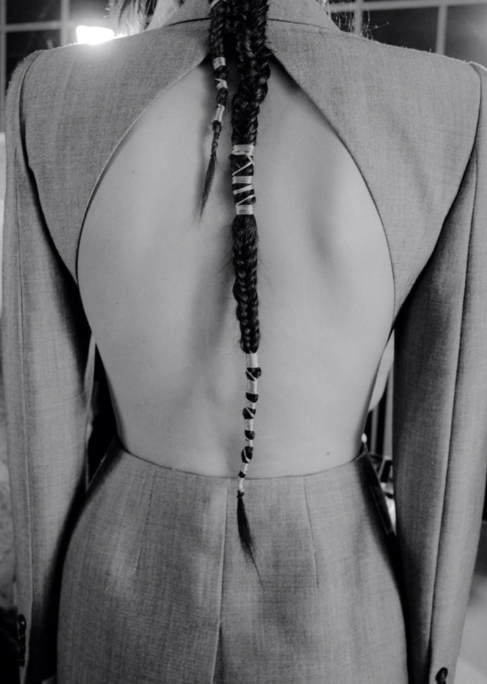 挺括硬朗的肩部与收腰设计,以及背部、腰部,甚至是臀部的镂空、裸露,都展现了刚毅与柔美并济的女性形象,透露出一种禁欲的性感。