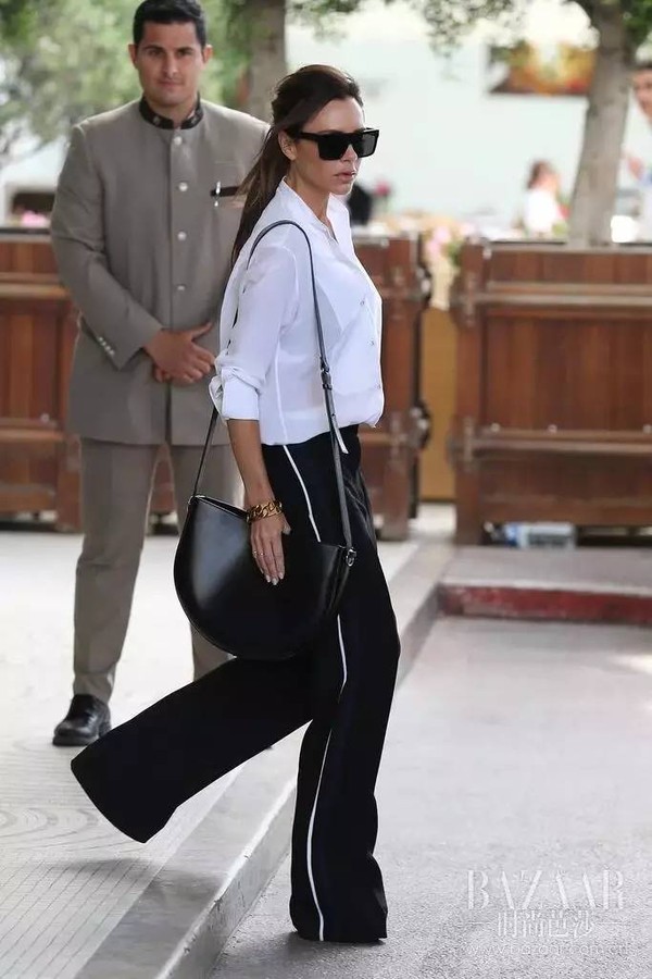 贝嫂一件白衬衫搭配侧边条纹运动裤,一如既往的潇洒又知性!