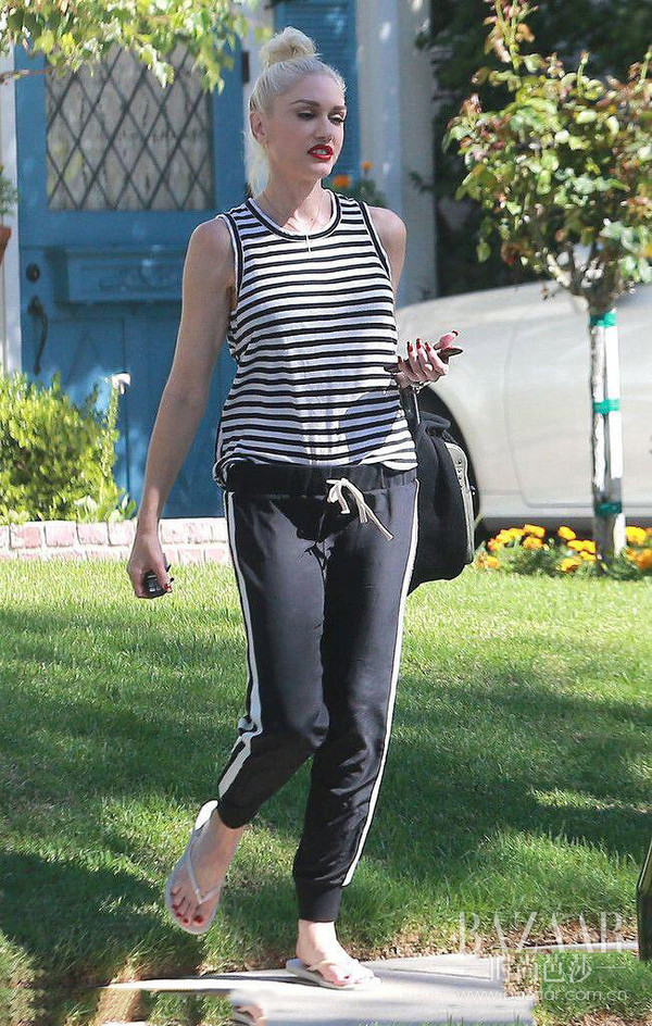 Gwen Stefani用条纹背心搭配运动裤,这身活力的休闲运动风搭配红唇好赞~