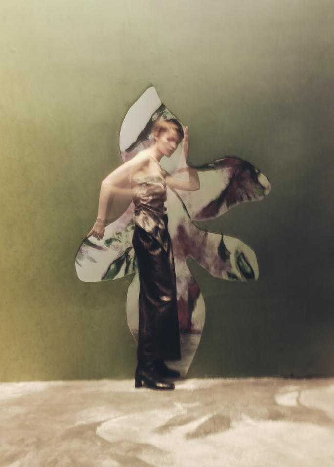 该系列以深秋原野上的干枯植物为灵感,将花朵、果实等表皮经历风吹日晒后的龟裂、褶皱等纹样转化为面料肌理,将不同灰度的彩色叠加在一起的复色灰配色通过阿苏特染工艺,并匹配简约实穿的廓形,为特立独行,大胆前卫的设计增添一丝原生态的狂野浪漫气息。