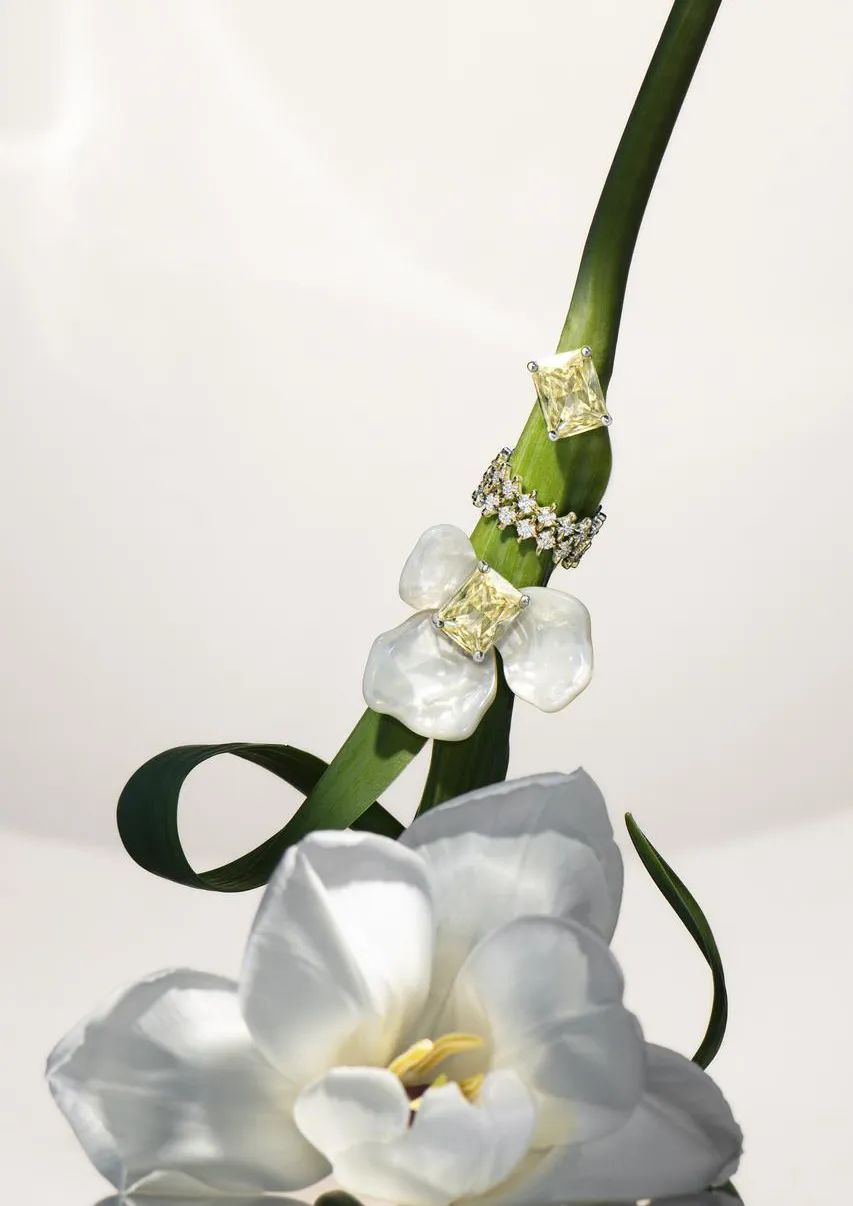 若花是春天给世界的情诗,那「白鸢尾方糖耳环」便是HEFANG给女孩们的春日告白。花瓣创新采用以自然植物花朵为原材料制造的环保板材制成,经由匠人八道工序的打磨抛光,每一片花瓣都呈现出独一无二的纹理与轻盈通透的高级质感,还原日光和水影映衬在花瓣上的粼粼波光。品牌标志性的淡黄色方糖石传递温暖治愈的力量,化作花蕊点缀于形态舒展的花瓣中间,花瓣的可拆卸设计满足多种佩戴场景需要。