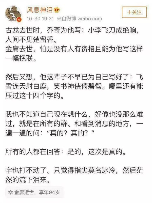 在这个十月的末尾,在这样平凡又普通的一天里,全中国的人们在同一天,失去了他们的江湖梦