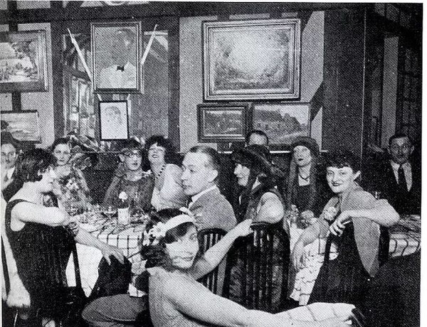 在1920年的蒙帕纳斯咖啡馆举办的午餐派对,Kiki位于前排中间。