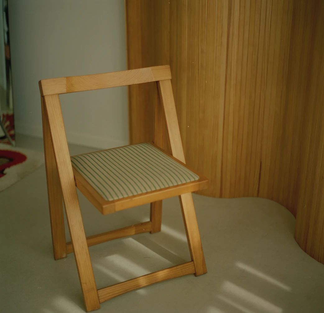 可折叠,非常轻便,坐垫软硬适中,非常复古的条纹。这种木色也特别百搭耐看。
