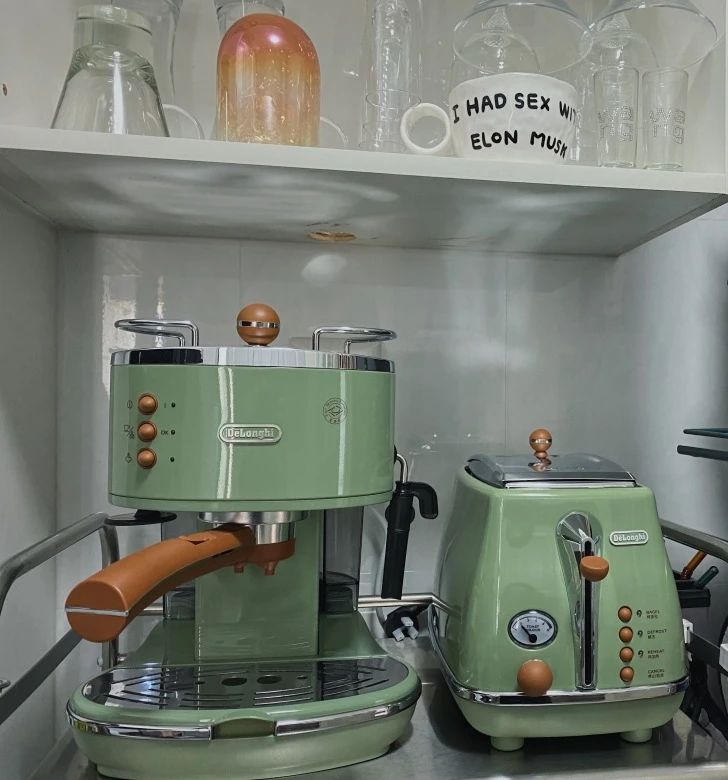 Delonghi咖啡机和面包机是闺密送的,上一层摆着很多我会常用到的杯子,左边是SELETTI x DIESEL 合作款的流星杯;右边是纯手工打造的订制的杯子,杯子上的这句话是我说的 😆