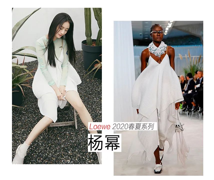 Loewe风琴褶的不规则吊带裙,原始又质朴。你幂脱掉了模特下搭的长裙,而改用薄荷打底衫叠穿,一副少不更事的模样。