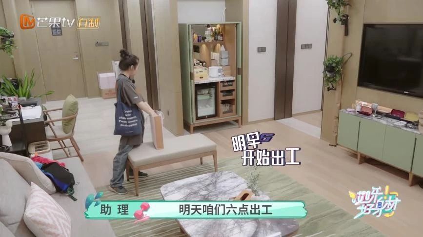 《哎呀好身材》里,张天爱晚上收工后回到酒店,明明工作完一整天,整个人累得腿都软的状态回到酒店,可到了房间,一放下包就跑进浴室开始自己晚间护肤日常
