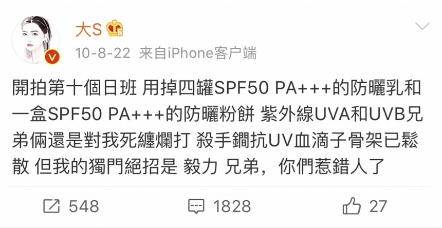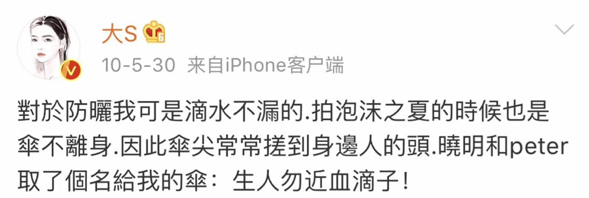 大S在2010年拍戏的时候,为了不晒黑,她十个工作日就可以用掉4罐防晒和一盒防晒粉饼,完全不会因为懒就少涂几次