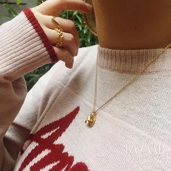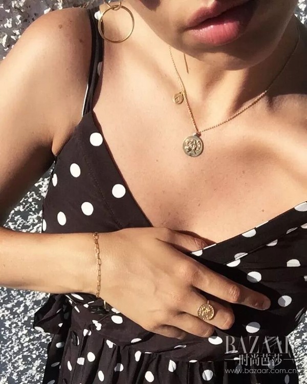 特别的是迷你版钱币项链,一个圆圆的小吊坠,与锁骨的相衬,十分凸显天鹅颈。