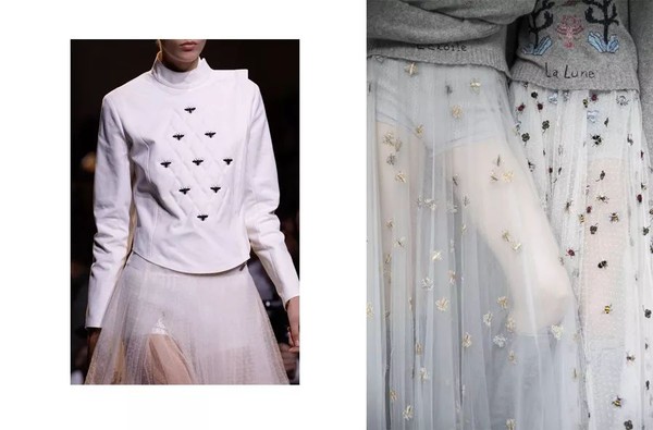 Maria Grazia Chiuri的蜜蜂不只是金色的,她喜欢用丰富的丝线和珠钉去塑造每一个立体蜜蜂造型,让细节更加玩味。