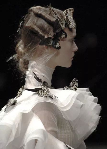喜欢使用昆虫作为灵感的不止Dior和Gucci,昆虫界的美丽象征应该为蝴蝶留有一席之地。Alexander McQueen对蝴蝶的偏爱人尽皆知。品牌的两任总监都曾设计了许多带有蝴蝶元素的单品。Alexander McQueen的2006秋冬大秀秀场上,McQueen给模特头上和身上点缀夸张的蝴蝶饰品,化身蝴蝶仙子。