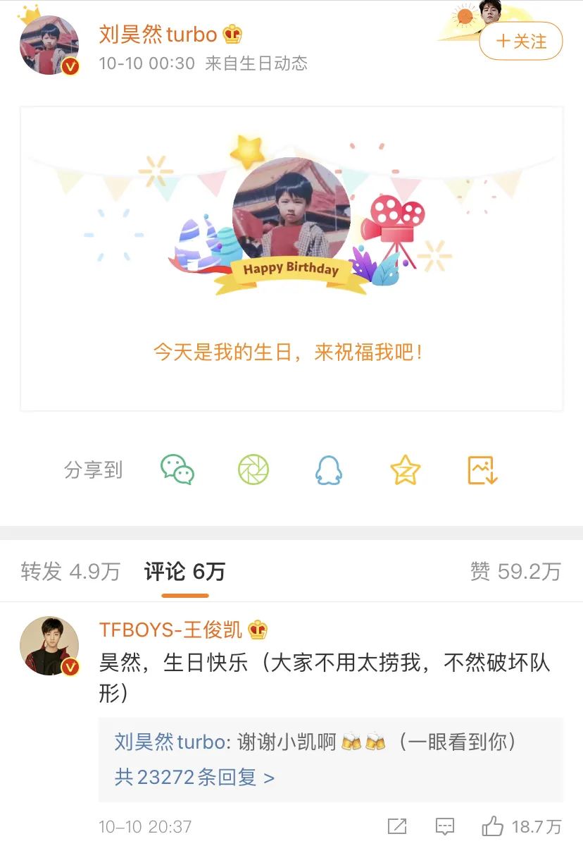 前两天,刘昊然迎来23岁生日,好朋友王俊凯贴心送上生日祝福,但怕破坏粉丝精心准备的队形,特别温馨提示:“大家不用太捞我,不然破坏队形。”小凯内心os:要低调也不能不理我。
