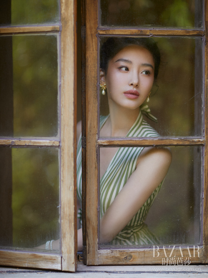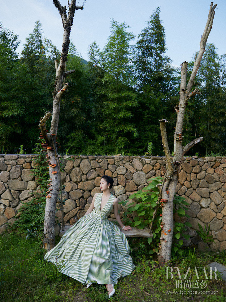 近日,青年演员杨采钰以一袭 CaRVEN 典藏 “Ma Griffe” 绿白条纹连衣裙复刻版亮相,漫步于绿意盎然的林中清新灵动,演绎法式优雅,重现经典摩登时代。