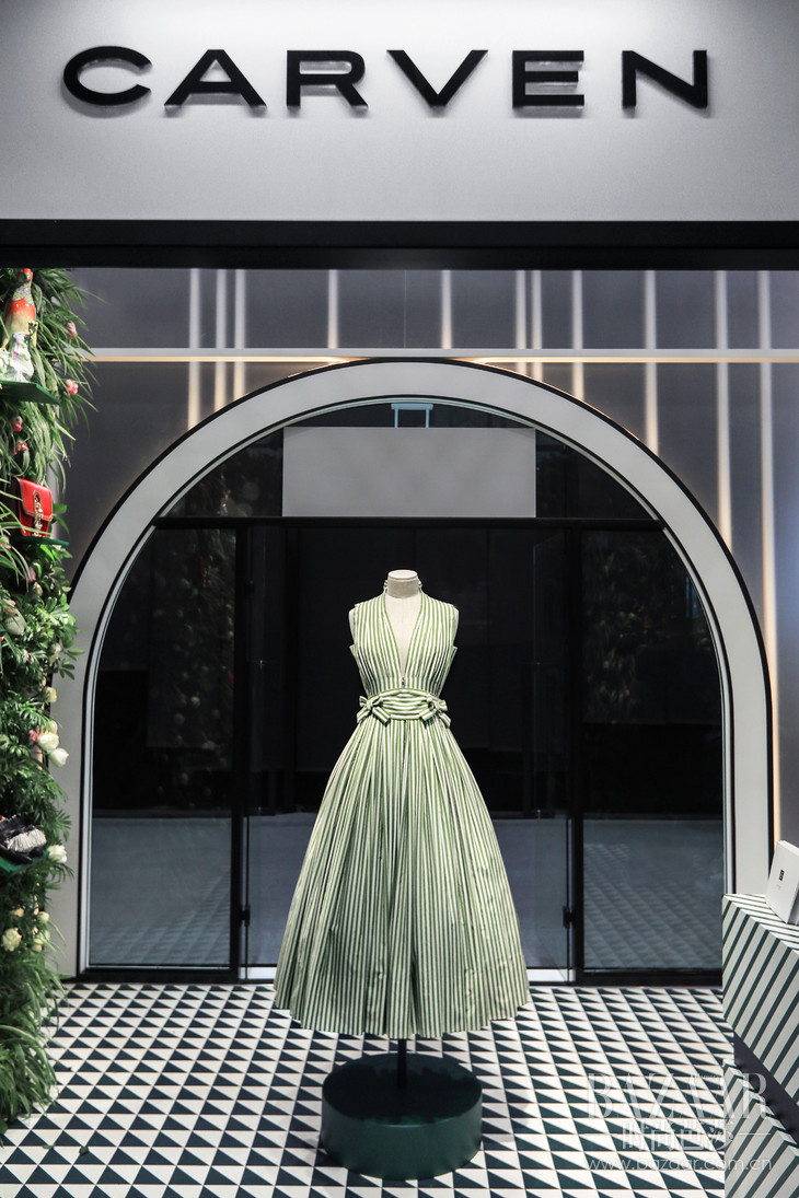 典藏 “Ma Griffe” 绿白条纹连衣裙复刻版首次亮相于 2021 首届中国国际消博会法国馆,中国海南