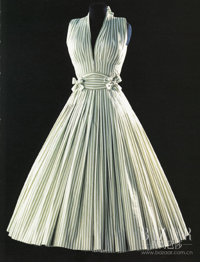 这条看似简单却与众不同的连衣裙,由卡纷夫人钟爱的青草绿与白色条纹相配设计而成,在当时打破了法国时装圈的两项桎梏:一是将“绿色”选作高级时装的主色;另外则是对平实棉布材质的开创性应用。