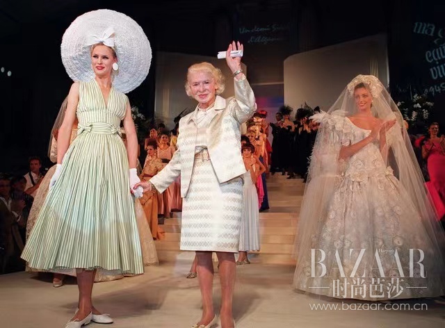 模特身着 “Ma Griffe” 连衣裙与卡纷夫人在 1995 年举办的 CARVEN 50 周年大秀,法国巴黎