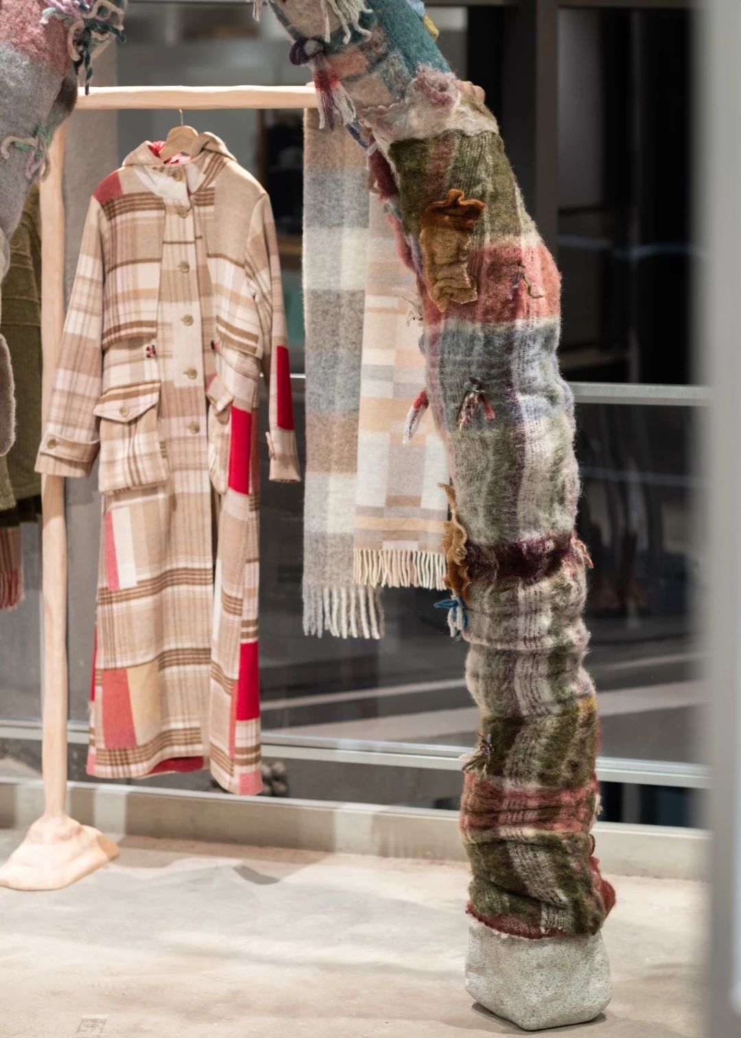 那这件作品的来源是哪里呢?这件作品是Gallefoss七年前用Holzweiler的围巾剩余辅料而设计完成的,通过Gallefoss的艺术视角,以一种全新的方式展示了Holzweiler的废旧回收围巾,诠释了品牌对回收和再利用的奉献精神。