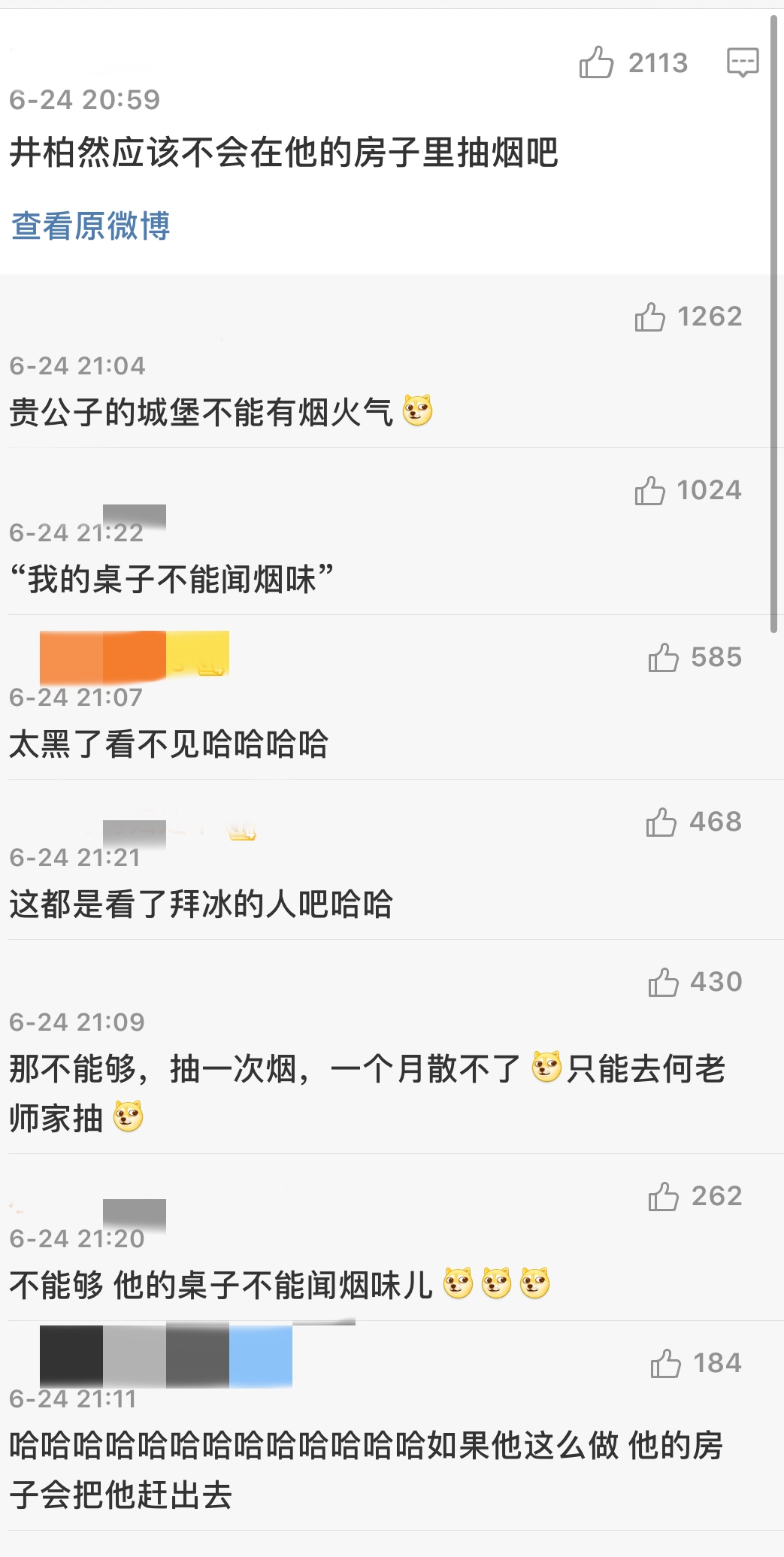 这条新闻下面的网友评论除了“哇”声一片,画风也从夸帅变成井宝会不会在家抽烟上:“井宝应该不会在他的房子里抽烟吧”,“对哦,他的桌子不能闻烟味”(狗头保命)