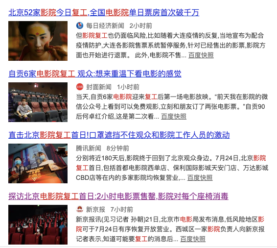 果然,心心念念,必有回响。就从7月20日开始,全国的电影院线会逐渐恢复开放。芭姐留意到猫眼电影的数据显示,电影院复工首日的票房突破了百万元;北京的电影院复工首日,两小时内电影票被售空……看来大家都对电影院的回归热情高涨,身边熟悉的一切也都在慢慢恢复到原先的轨道中。