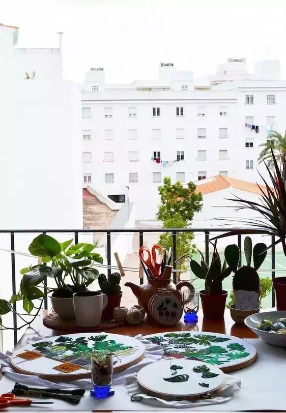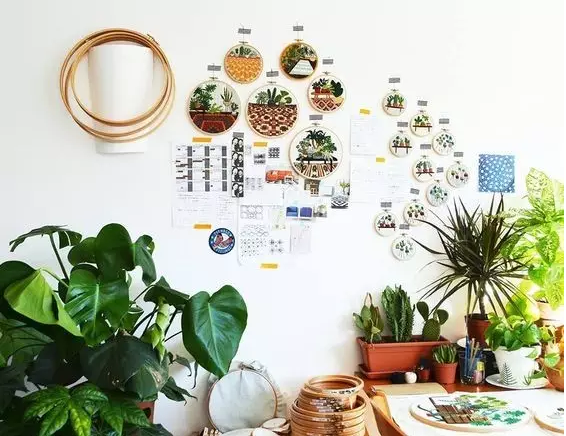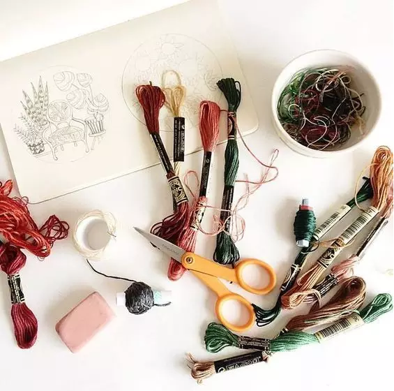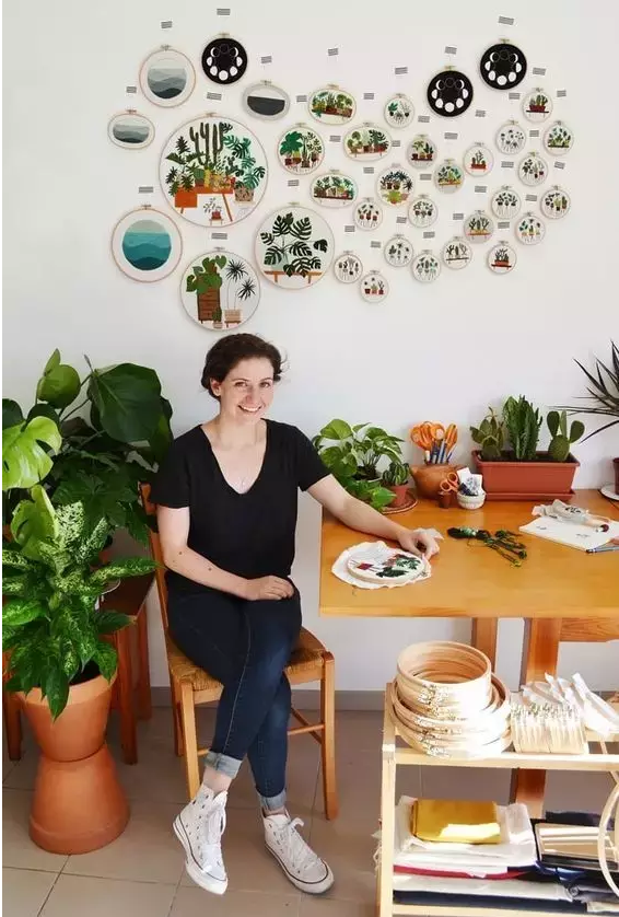 她在创造时的状态,先画小的草稿,再将这些作品画在布上,然后选线,一针针缝上去。