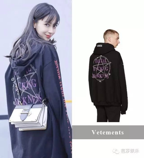 【时尚芭莎网讯】aries 前几天芭姐被baby的一身打扮惊艳到了 Baby穿着Vetements的男款Oversize的帽衫,整个人感觉都特别娇小再加上齐刘海的新发型,真是少女感爆棚! 大幂幂之前也在微博上Po过自己穿这件帽衫的照...