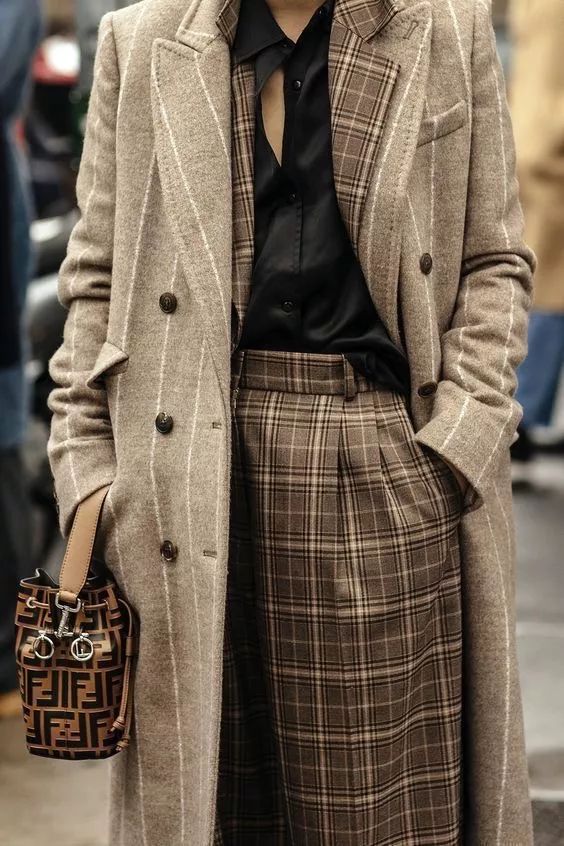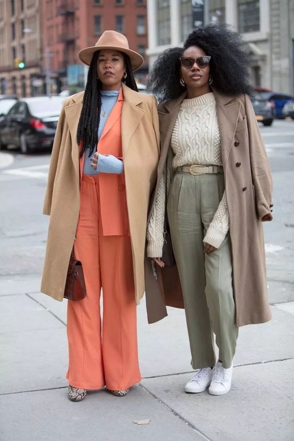 外套和套装之间的撞色游戏,冷暖相衬、相辅相成,也是趣味十足的看点。