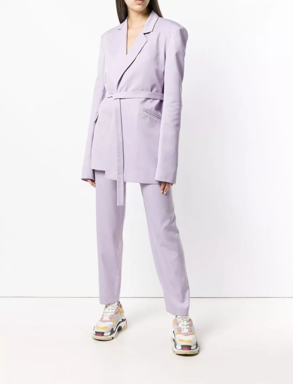 内搭套装上下一体都是同样的颜色,外套的门襟也直接将身体分割成长条状,在视觉上带来极佳的显瘦效果。加上一条腰带勾勒腰身,更是让你的长腿无处可藏。