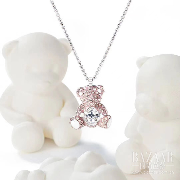 备受欢迎的SWAROVSKI TEDDY系列以可爱的泰迪熊造型为设计灵感,密镶施华洛世奇仿水晶,通过独特的悬浮设计,动静之间释放趣致光芒。白色泰迪熊造型,缀以梦幻般的糖果粉色心形仿水晶,尽显女士的俏皮和浪漫。男女皆宜的黑色泰迪熊造型,为经典的泰迪图案增添炫酷摇滚气息。