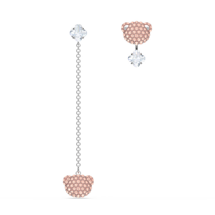 让这款多变的耳环采用时尚的不对称设计。一只耳环以泰迪熊面部造型为设计灵感,缀有一颗施华洛世奇白色仿水晶;另一只耳环为施华洛世奇白色仿水晶耳钉并带有一条可拆卸的链子,链端配有一个泰迪的图形。为日常装扮增添一抹趣味的理想之选。