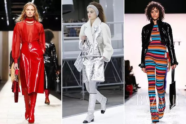 秋冬T台上的漆皮单品,不仅止于皮夹克了。Chanel夹克和半裙的“柔亮”、Fendi半裙和过膝靴的“鲜亮”,带光泽的漆皮单品增添不少高级感。