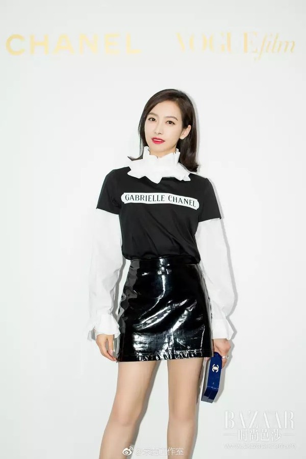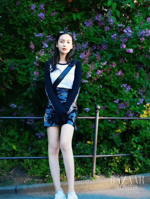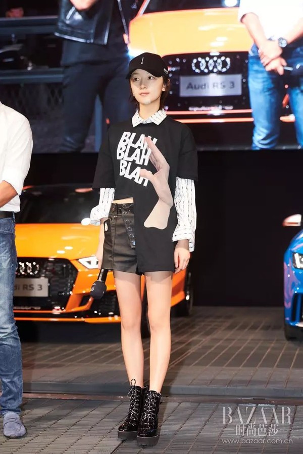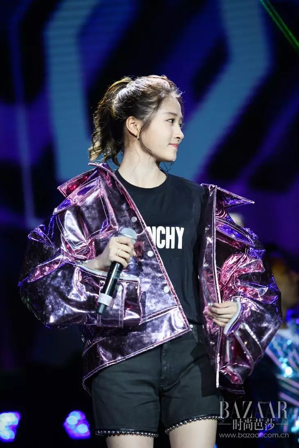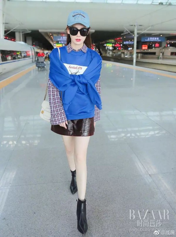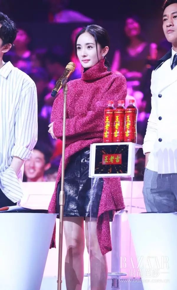 厚重的套头针织衫,杨幂搭配一件漆皮短裙,瞬间满满少女感。