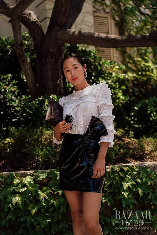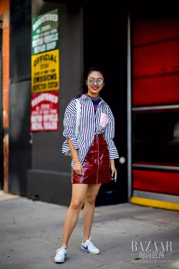 少女感的简约衬衫和小白鞋,让漆皮短裙的成熟化为少女独有的混搭时尚。