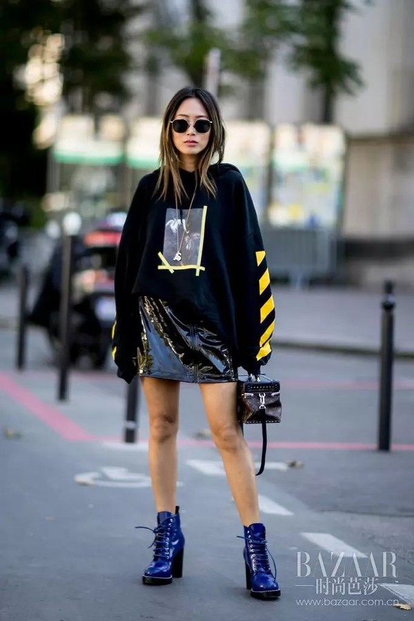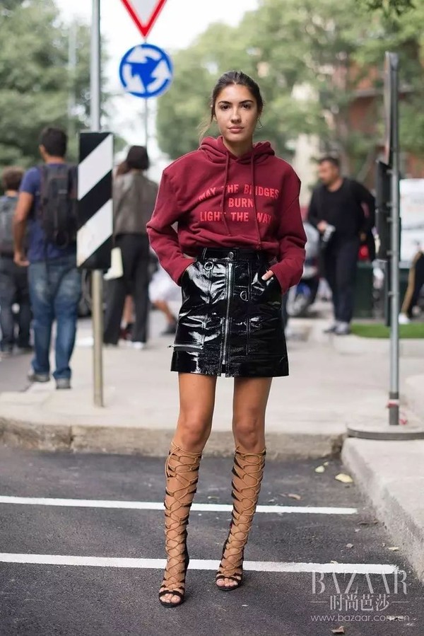 ▼ 漆皮短裙 + 卫衣,混搭时尚感