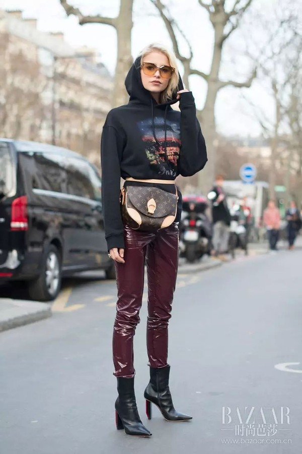 漆皮长裤的成熟和性感,就要搭配青春洋溢的卫衣才不会太Over。
