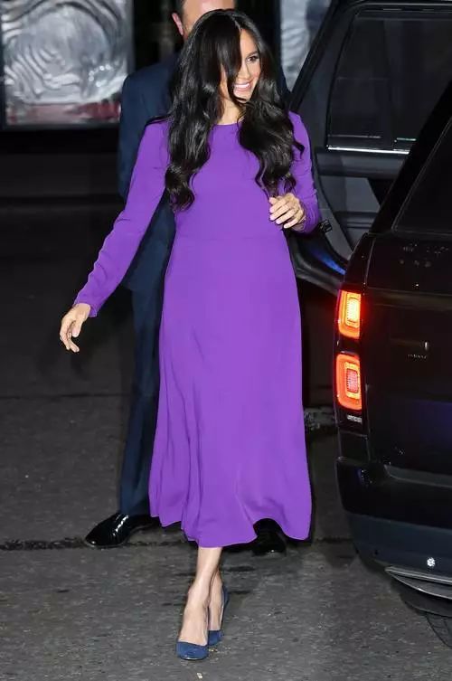梅根这次出访竟然带了很多旧衣,比如在伦敦出席名为the One Young World summit 开幕式活动时,她穿的紫色连衣裙就是之前怀孕时穿过的一件,只不过当时还加了件红色大衣。