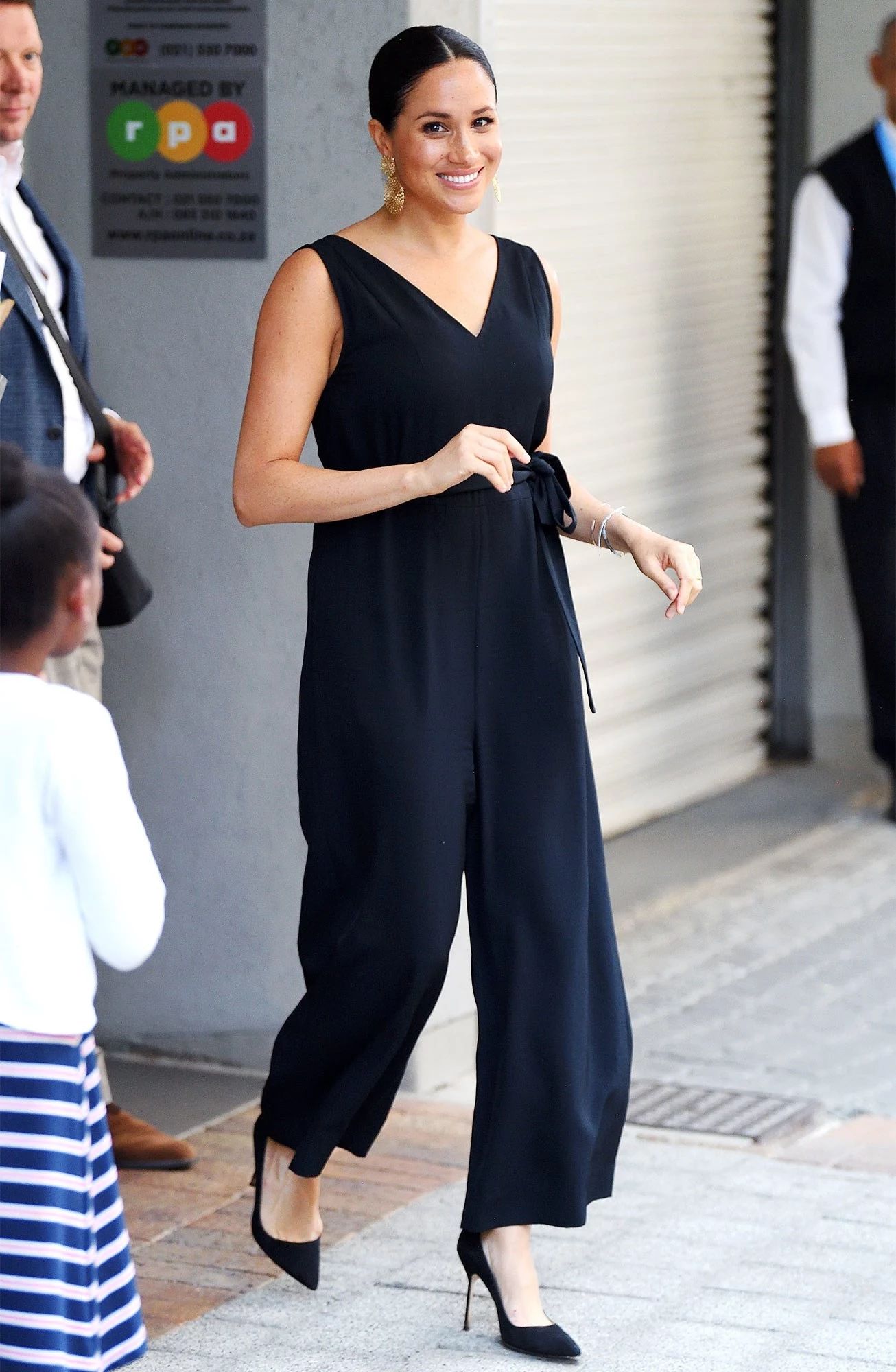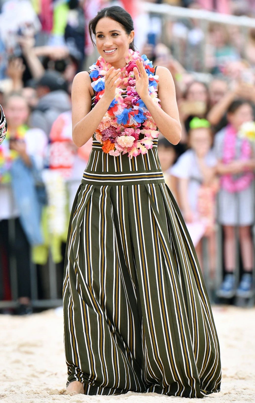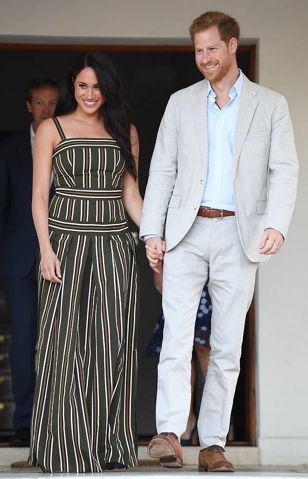 梅根去年出访穿过的Martin Grant条纹吊带裙,当时戴了花环,光脚走在沙滩上,很是应景,今年在城市中走就穿了常规的高跟鞋。