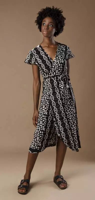 这件黑白印花的裹身裙则来自Mayamiko,穿上就很热情,正好适合跟当地的民众一起跳舞,售价只要600元。